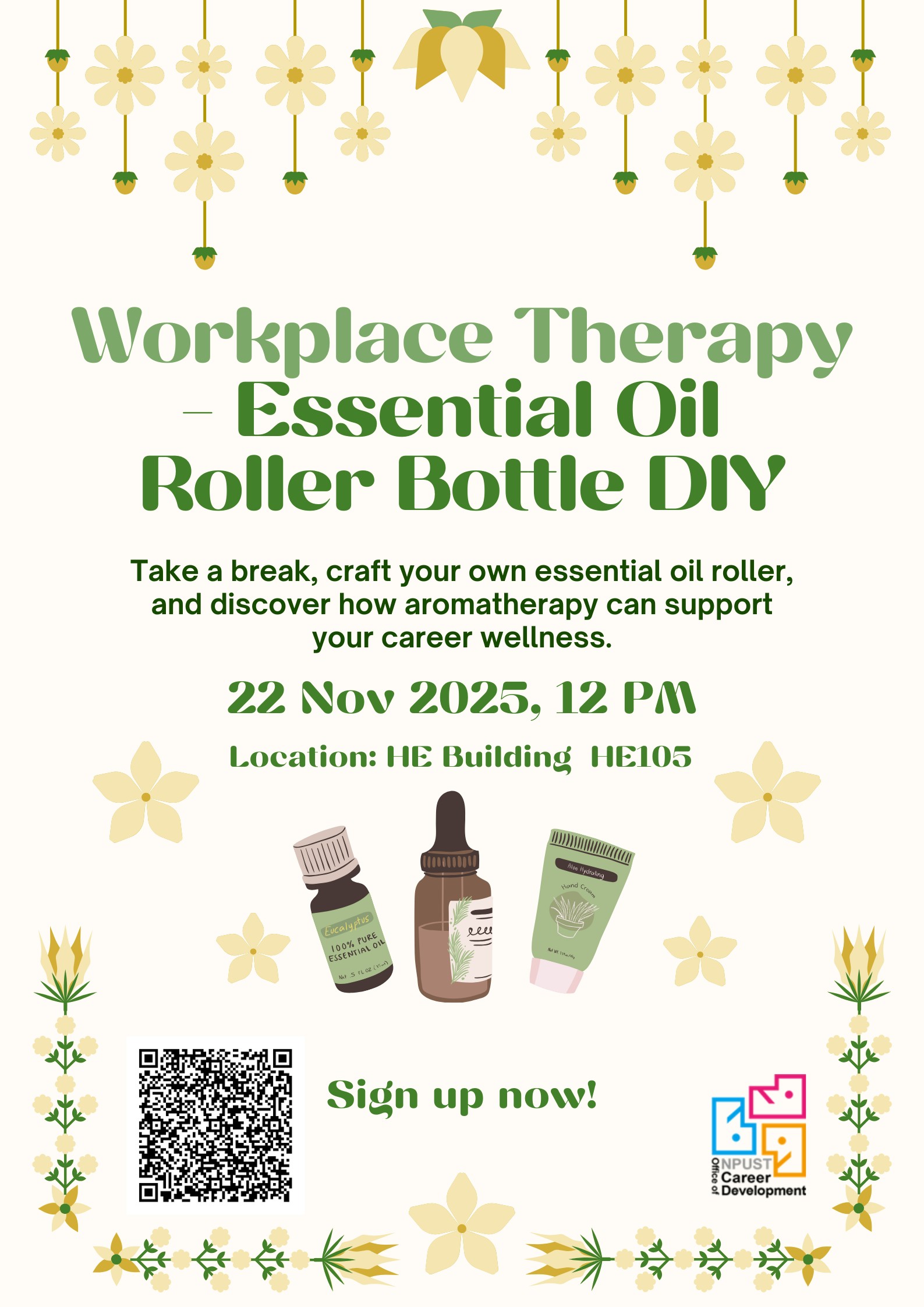 Join us for a hands-on aromatherapy workshop where you’ll create your own custom essential oil roll-on bottle, designed to soothe the mind and support your well-being — in and out of the workplace.